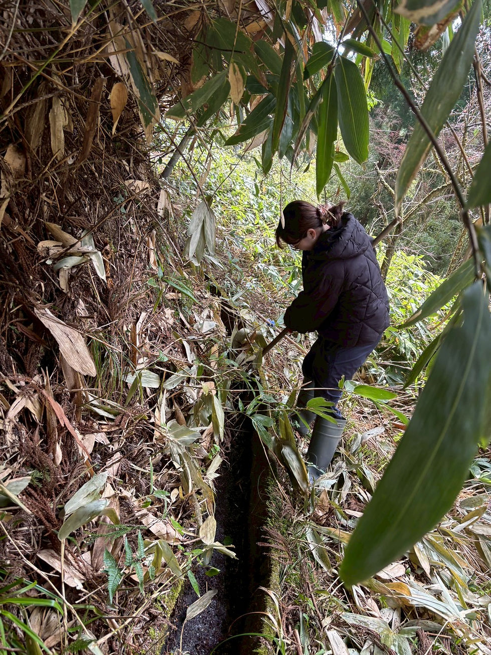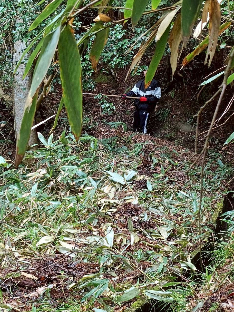 今回の水路清掃は山際で行いました。木の枝や、土、松の葉が溜まってしまってました。この水路が通るようにならないと、田んぼに流れる水の流量が減ってしまいます。なので水路清掃を行うんです!