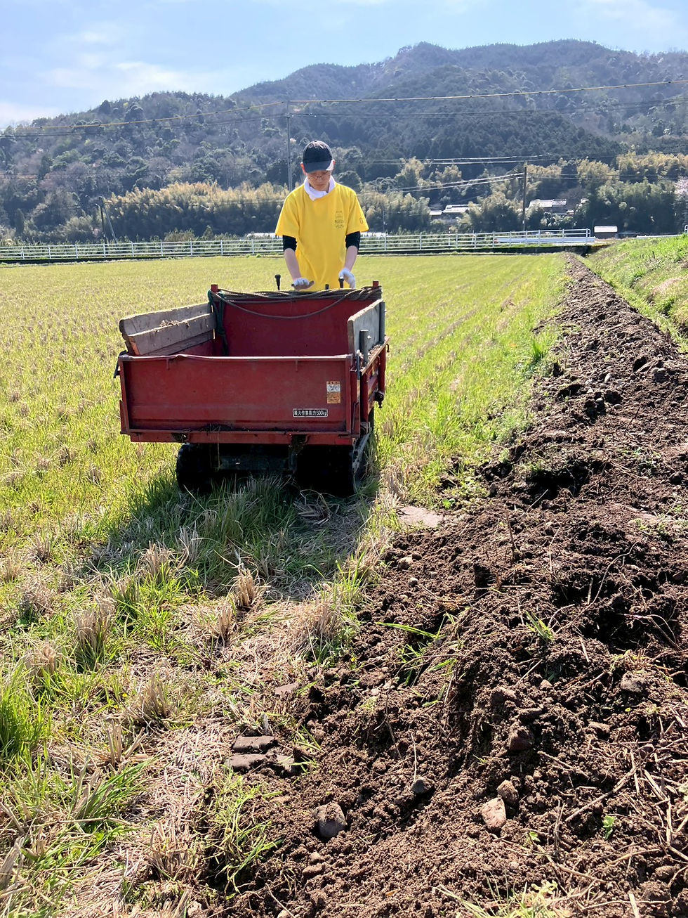 午前は田んぼの畔に除けた水路の土砂をスコップで運搬車に乗せ、別の場所に運びました。その際、運搬車を使わせていただきました。